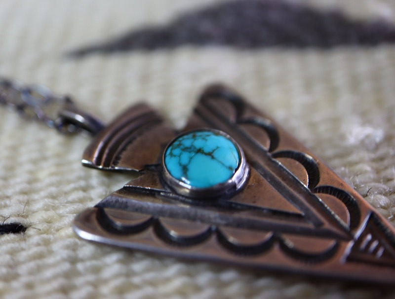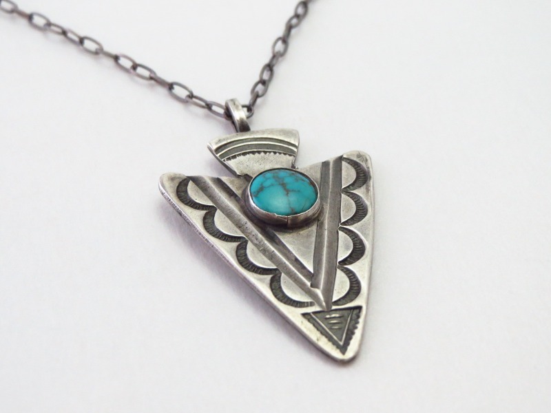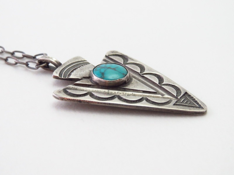 【NAVAJO】ナバホのアンティークジュエリーで、アイコニックなアローヘッドシェイプのトップ。シンプルながら非常に質の高いシルバーワークで制作され、美しいターコイズがマウントされたアンティーク/ビンテージネックレスです。