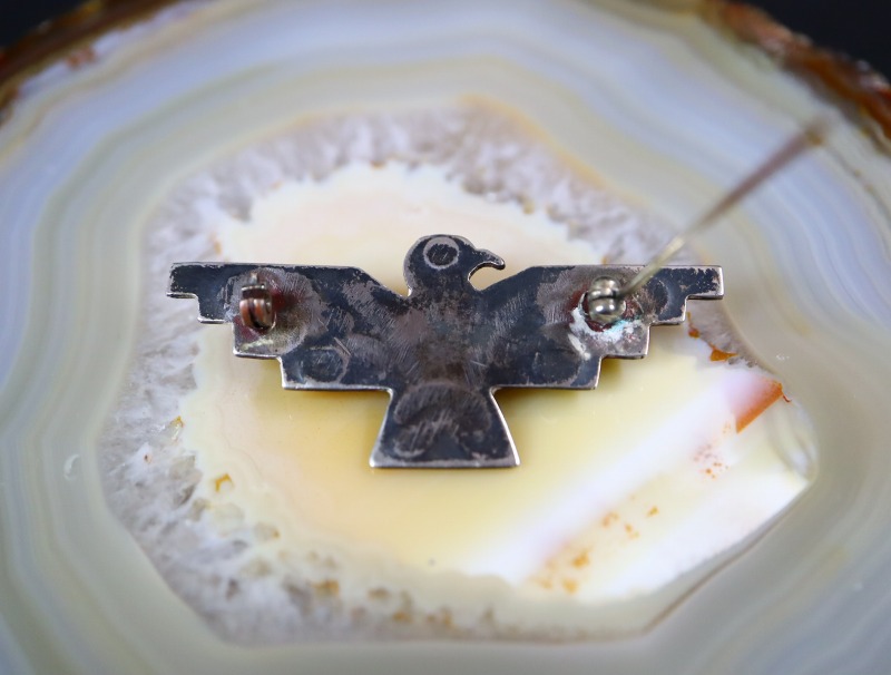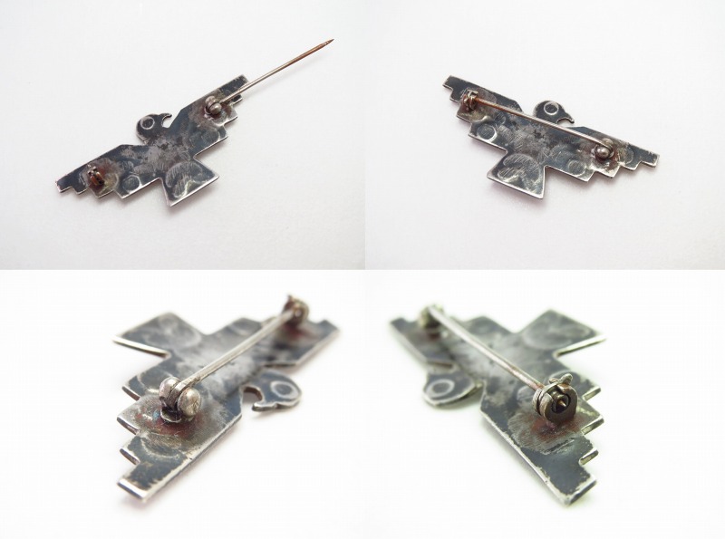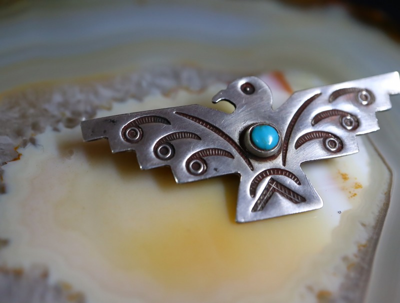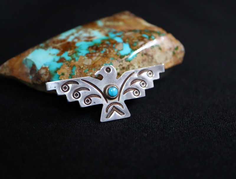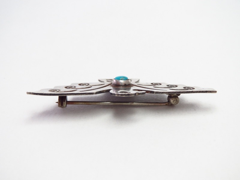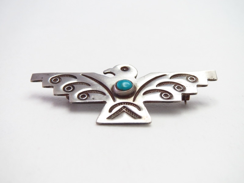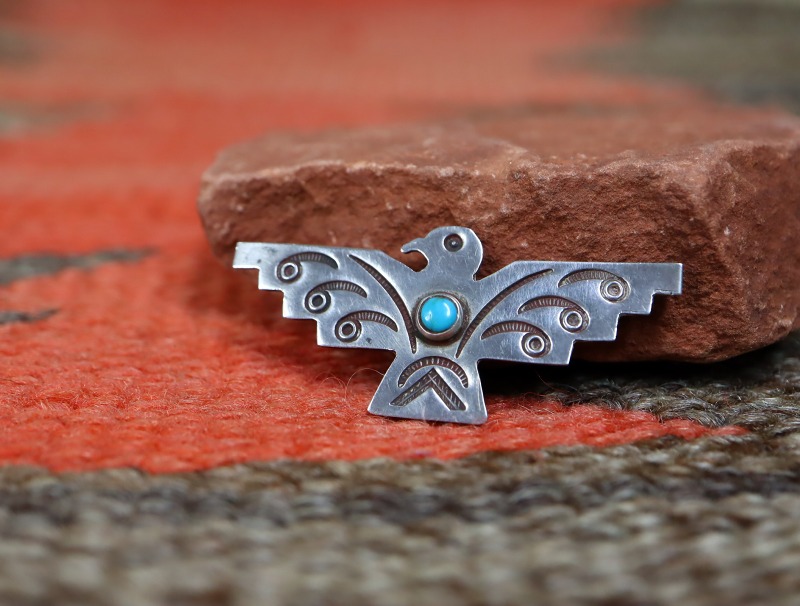 【NAVAJO】ナバホのアンティークジュエリー、オーセンティックなサンダーバードモチーフの作品。丁寧なハンドメイドのシルバーワークによって形作られた小さなアンティーク/ビンテージピンブローチです。