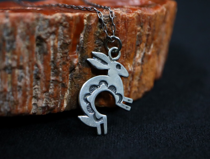 【Rabbit】ウサギは、多くの部族においてトリックスターとして扱われており、中西部のインディアンでは、ナバホ以外のプエブロインディアンの多くの工芸品で見つけることが出来るモチーフです。豊穣や多産を意味する事もあるアニマルモチーフとなっています。