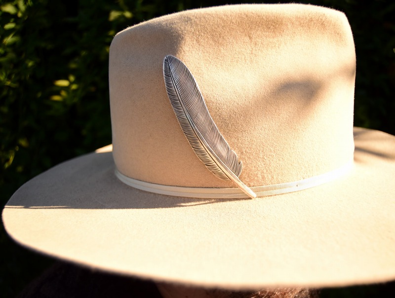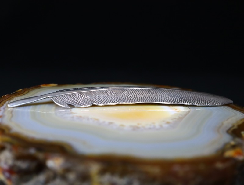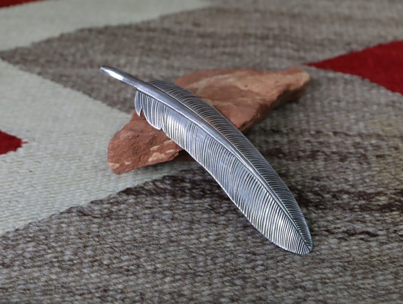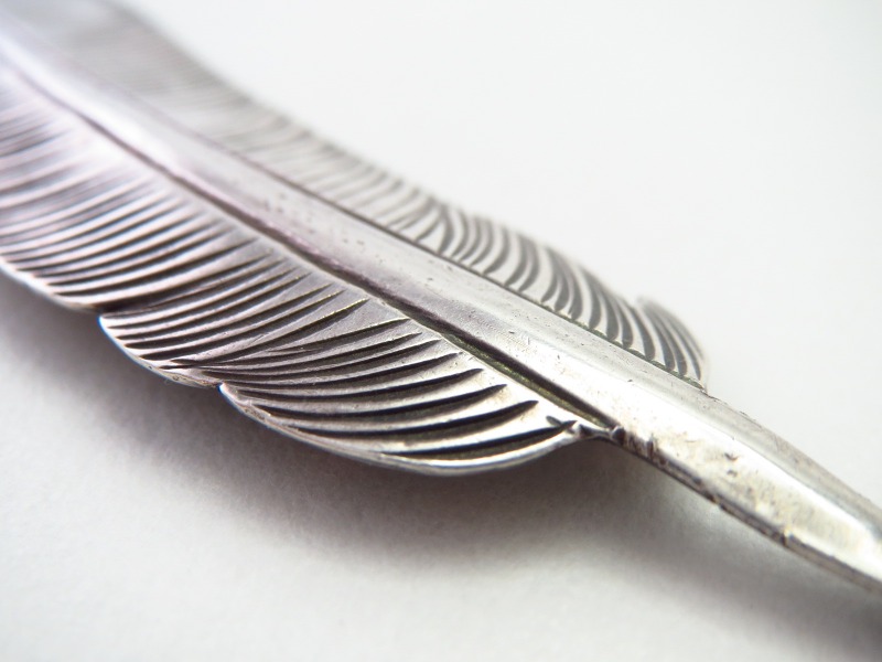 コインシルバーのインゴット(銀塊)から成形された地金をベースに、大きく写実的にイーグルフェザーのシェイプが形作られています。そこに、繊細なスタンプワークによって、細かな羽枝が表現されています。さらに、羽軸を中心として、巧みなハンマーワークによって柔らかな膨らみ/アールが与えられています。このようなアール/曲面のディテールは、硬い木の土台や鉛の塊にアール(曲面)の溝/凹を彫り込んで、そこにシルバーを叩き添わせることによって立体的な造形を作り上げています。またその立体感により、独特な上質感や奥行きが与えられており、フラットなシェイプよりも美しく際立った存在感を放つ作品となっています。
