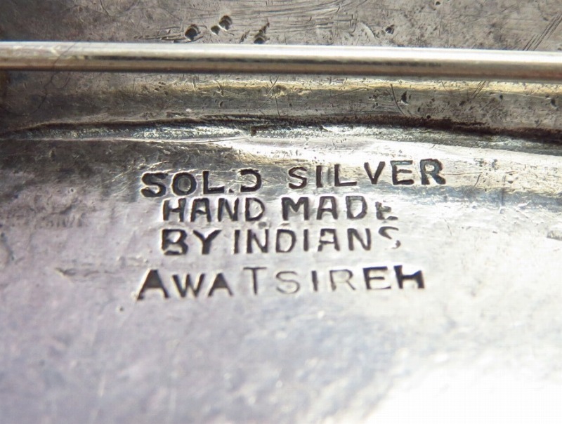 内側に刻印されている『SOLID SILVER HAND MADE BY INDIANS』の表記により1930年代頃に同トレーディングポストで作られた作品と判断でき、さらに作者個人のホールマーク『AWA TSIREH』の文字が刻印された史料価値の高いミュージアムクオリティーのピースになります。