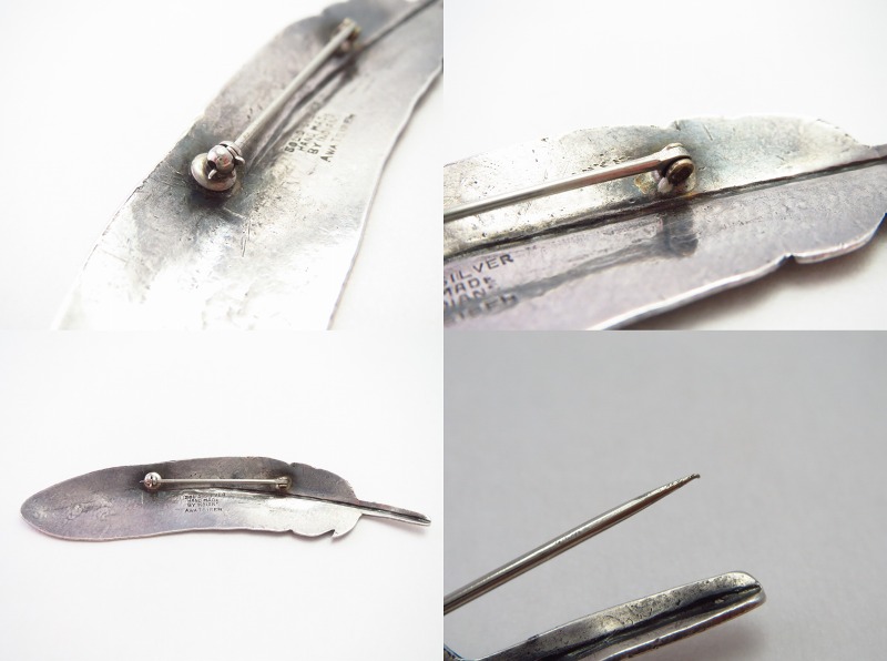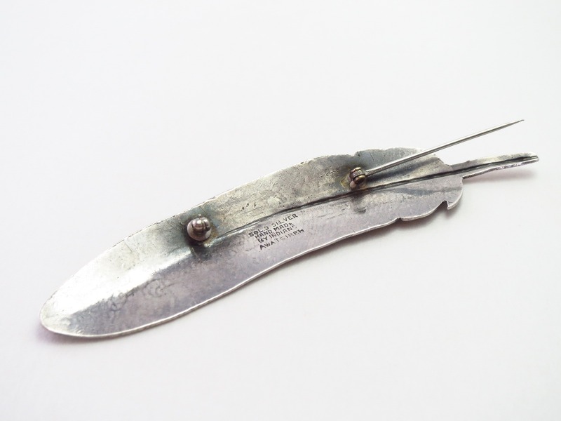 さらに、1960年代頃の作品ではナバホの巨匠Mark Chee】マーク・チー(1914-1981)の作品にもフェザーをモチーフとした髪飾りが発見されていますが、これら以外に古い年代のファザーモチーフ作品は確認されておらず、本作を含めAwa Tsirehが数点制作したと推測されるピンブローチが、インディアンジュエリーにおける最古のフェザーモチーフ作品と推定されます。