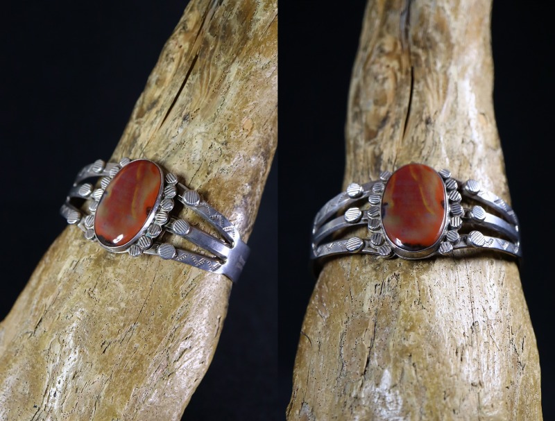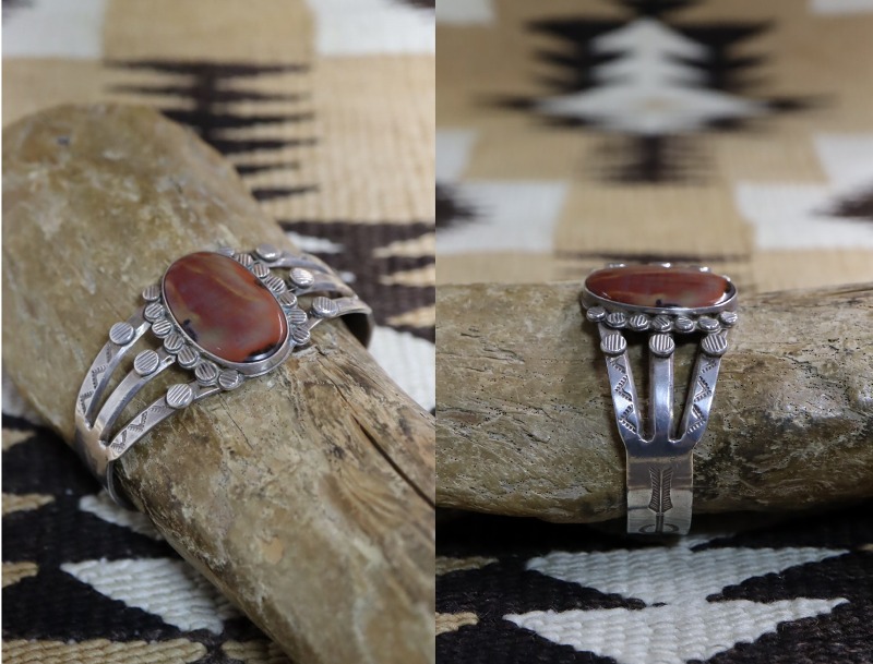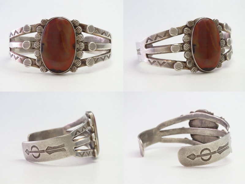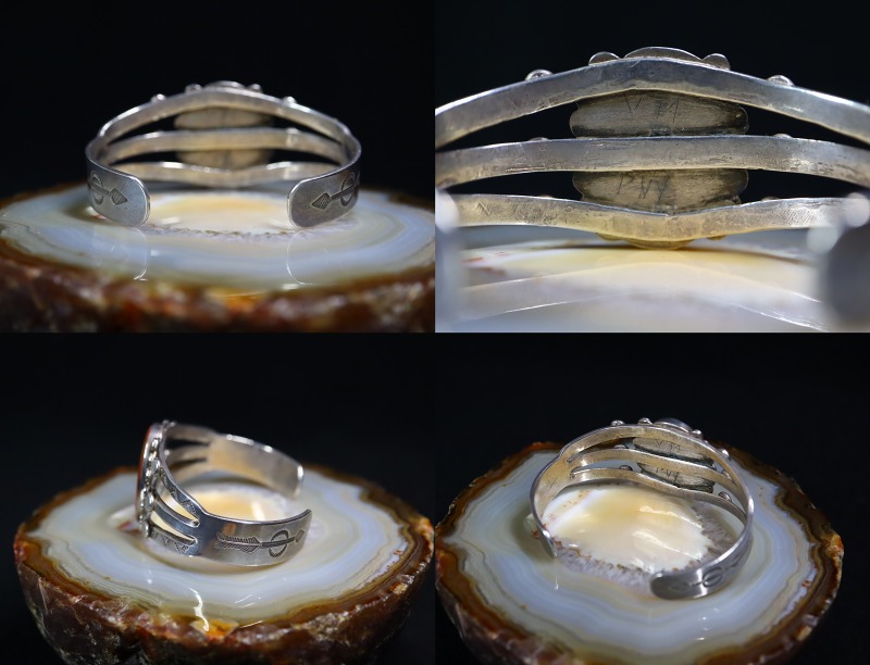 ナバホのオーセンティックな造形に仕上げられたバランスの美しい作品で、残念ながら作者は不明となっていますが、トラディショナルで洗練されたデザイン/造形やサイドに刻まれたスタンプ(鏨)などからは、ナバホの偉大な作家【Fred Peshlakai】 フレッド・ぺシュラカイ(1896-1974)を想起させる作品となっています。