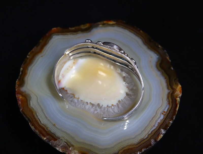 本作にマウントされたペトリファイドウッドもインディアン居留地に近い場所で産出したものと思われ、アリゾナ産らしい色調に強いブラックやオレンジ、さらにイエローまで入り『Rainbow PetrifiedWood』と呼ばれ、珍重される質の高い石となっています。柔らかい色相ながら、パープルを基調に多数の色彩が織りなす景色はどこか妖しげで、強い透明感による奥行きも感じられます。ナバホジュエリーらしいシルバーワークとの意外性も魅力的な、美しく豊かな表情を持ったペトリファイドウッドとなっています。