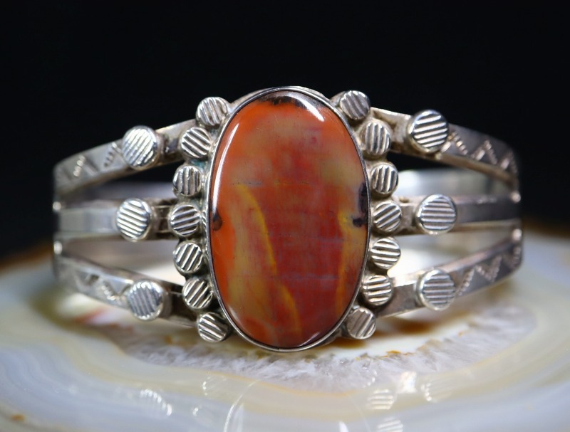 【NAVAJO】ナバホのアンティークジュエリー、トラディショナルなシルバーワークをベースに、妖しくも美しい【Petrified Wood】ペトリファイドウッド(珪化木)がマウントされた作品。両サイドに刻まれたアローのスタンプワークも特徴的なアンティーク/ビンテージバングルです。