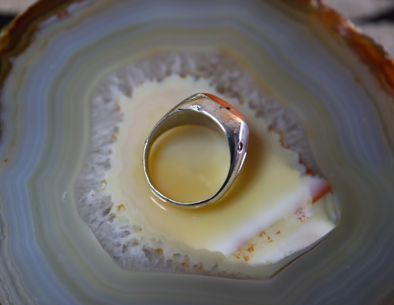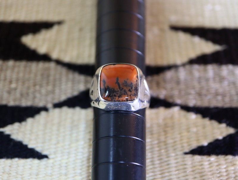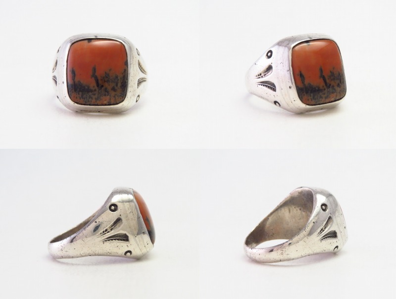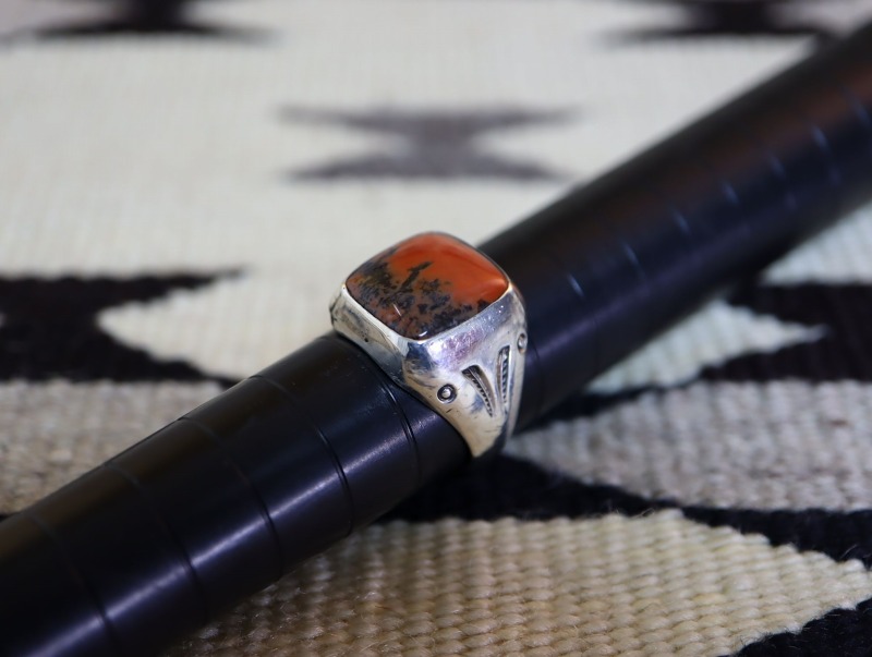 そんなペトリファイドウッドとクリーンな表情のシルバーワークを組み合わせることで、古い作品でありながらビンテージインディアンジュエリーとは異なった魅力を放つリング。有機物を起源とするオレンジと黒で構成された石は、柔らかな光を宿しシックで落ち着いた表情となっています。
