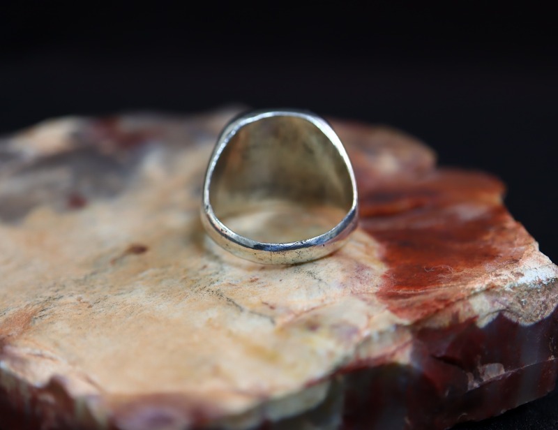1940年代後半~1950年代頃に制作されたピースと思われ、キャストによって成形された重厚なシャンク/地金に、スクエアカットされた美しいペトリファイドウッドがセットされています。Seal Ring/シールリング(印台型)に近いクラシックなシェイプに形作られ、石を固定するベゼル(覆輪)部分は、石のシェイプに合わせて非常に綺麗に造形されています。目立たないディテールですが、細部まで美しい仕上げが施されたシルバーワークとなっており、その洗練されたシルバーワークにより、シルバーとペトリファイドウッドが一体化したような造形が実現しています。そして、シャンクのサイドにはさりげなくも力強いスタンプワークが刻まれ、シンプルでクラシックなリングにナバホジュエリーらしい表情が与えられているようです。