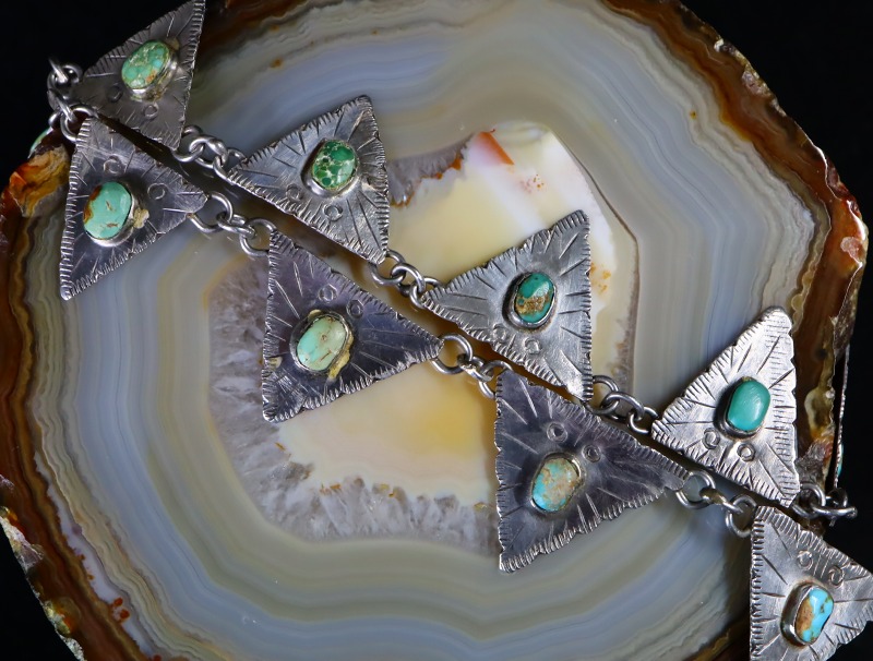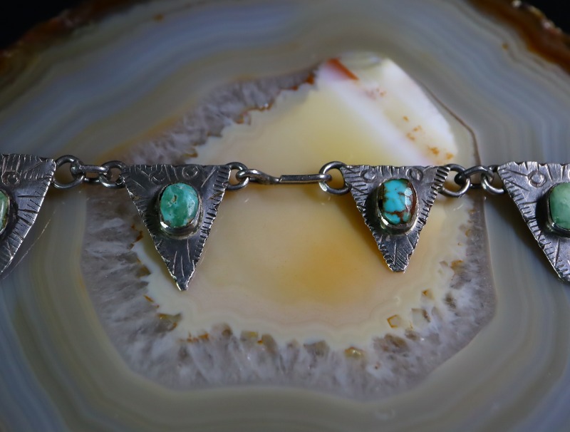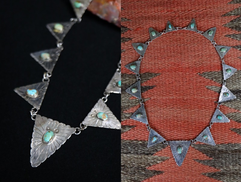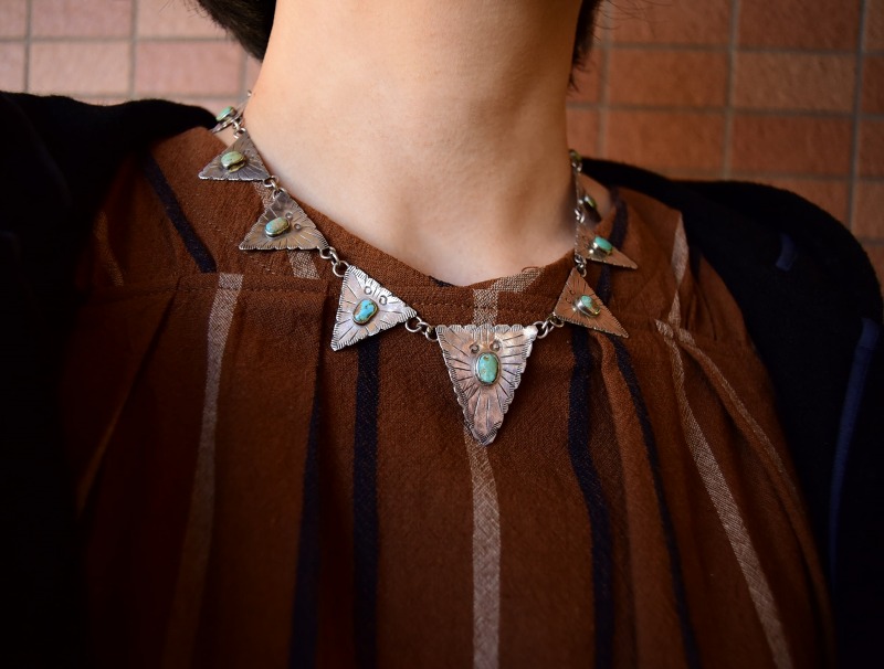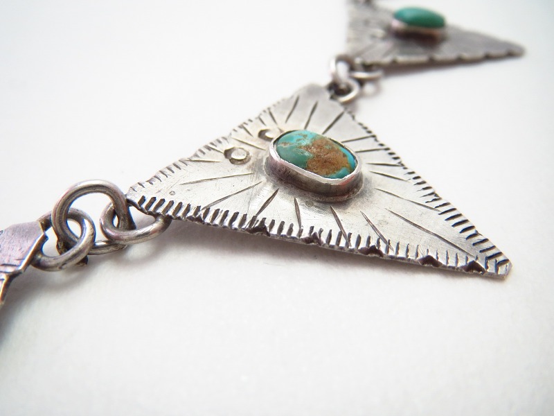 1930年代後半~1940年代頃に制作されたものと思われる作品で、スタンプワークやファイルワークと呼ばれるヤスリで削る技術を用い、バースト状の模様やエッジの刻みが施された三角形のタブパーツを丸環によって連結する事で構成したネックレスです。また、それぞれに味わい深いターコイズがマウントされており、ナバホジュエリーらしい味わいとなっています。