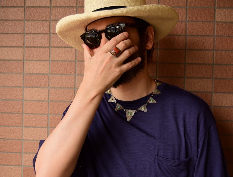 シェイプの作る楽しい印象が特徴的なネックレスですが、シルバーワークには武骨でビンテージインディアンジュエリーらしい表情も感じられ、性別や季節を問わず多くのスタイルにフィットさせることが出来るアイテム。日常的なスタイルのスパイスとなってくれると思われます。