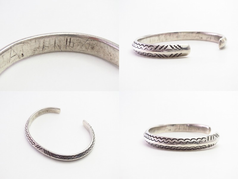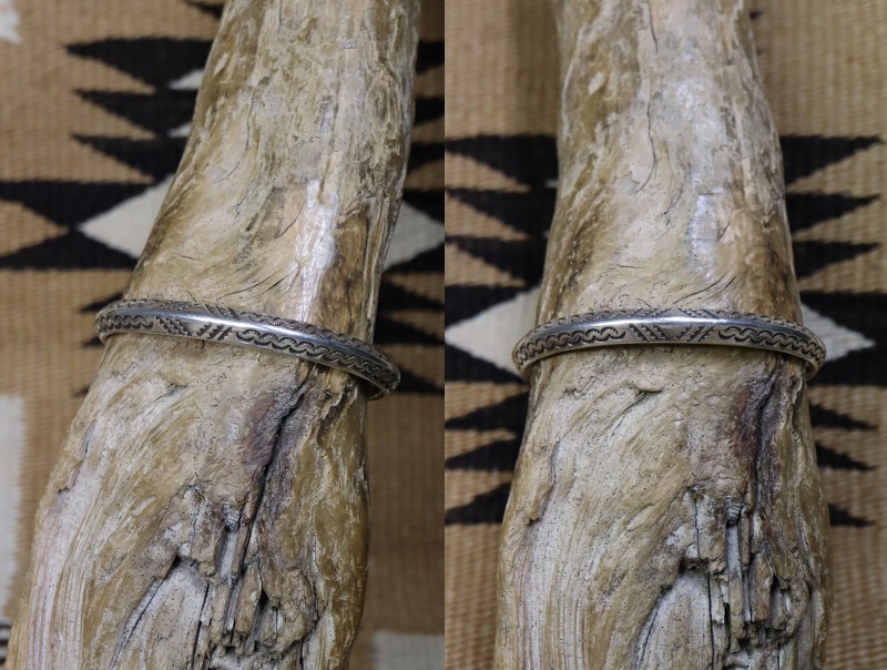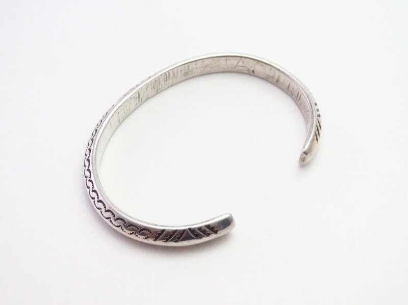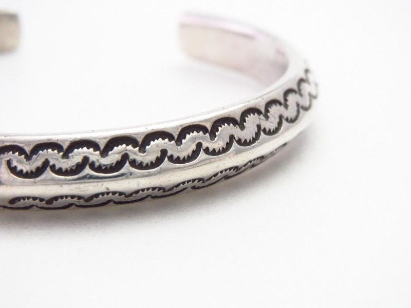 そうして成形されたバンドをベースとして、原始的でありながら非常に魅力的なスタンプワークが施されています。僅か2種類のみのスタンプ(鏨)ツールを使い巧みに幾何学模様が刻み込まれ、まだナバホとプエブロの作品に明確なデザイン/造形の差異のない時代のピースですが、おそらく初期のナバホ作品と推測されます。