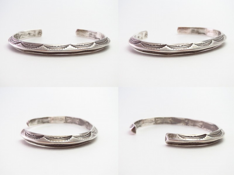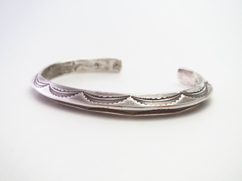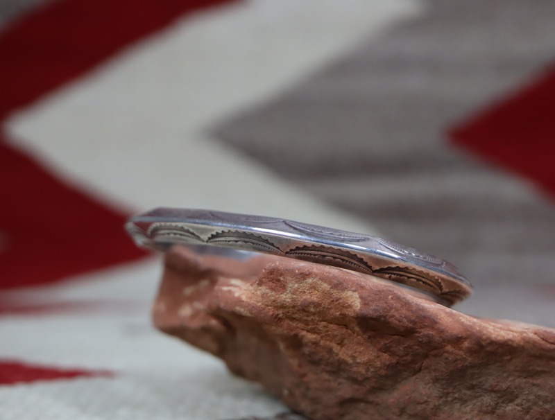 武骨で力強いなスタンプワークによってエスニシティでインディアンジュエリーらしいデザイン/造形に仕上げられたブレスレット。ナバホジュエリーはもちろんですが、ホピやズニの作品等、部族を問わず他作品とも馴染みの良いピースであり、エッジーでオーセンティックな印象は他のバングルとの2連、3連等、重ね付けにも向いたピースですが、単体でも十分に存在感を示します。
