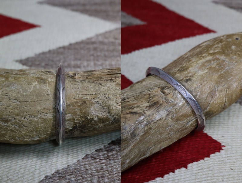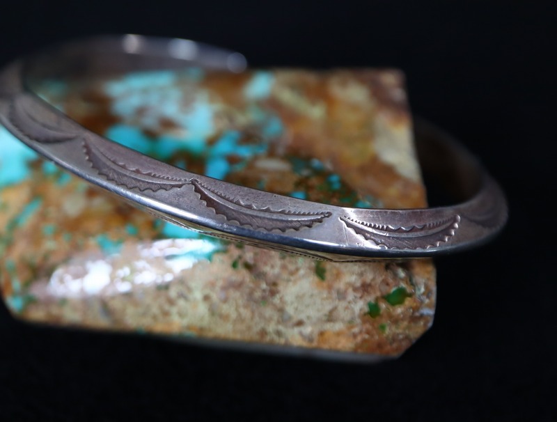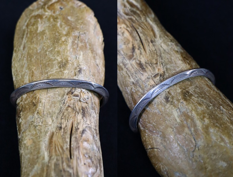 伝統的なトライアングルワイヤーをベースとし、こちらもナバホジュエリー伝統を踏襲したベイナースタンプ(半月型の鏨)を基本とした複雑な文様を刻むスタンプが連続して刻まれています。ナバホの作品との差異を見つけるのが難しいブレスレットですが、単一のスタンプを羅列した構成には、少しコチティのシルバースミスらしい印象も感じられます。