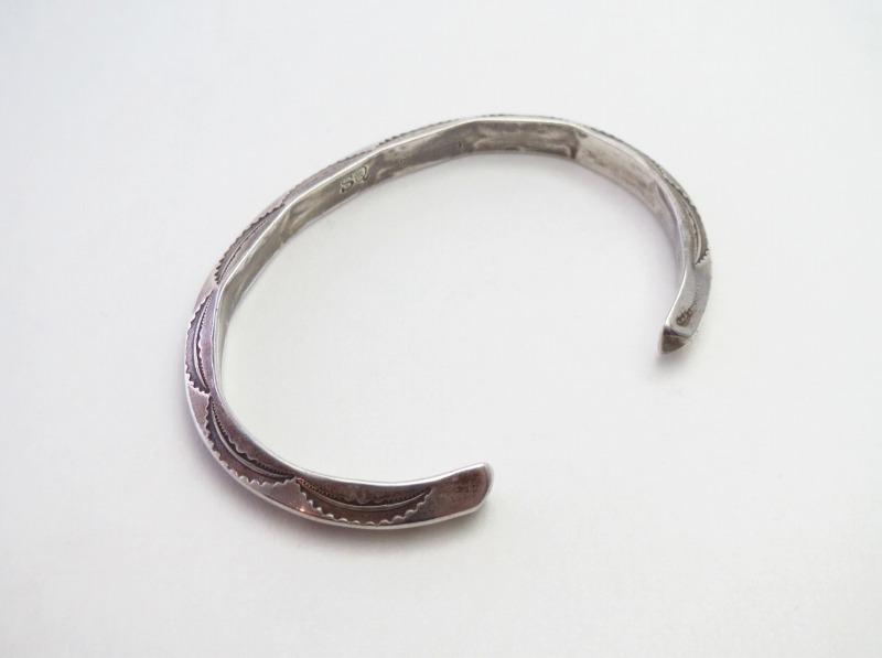 【Cochiti】コチティを代表するシルバースミスの一人である【Silviano Quintana】シルビアーノ・キンタナ(1915-2003)の作品。伝統的なスタイルの一つであるトライアングルワイヤーをベースに、オーセンティックで秀逸なデザインを生み出すスタンプワークが施されたアンティーク/ビンテージバングルです。