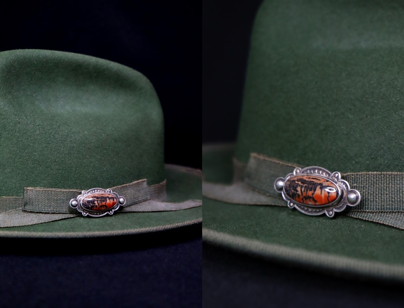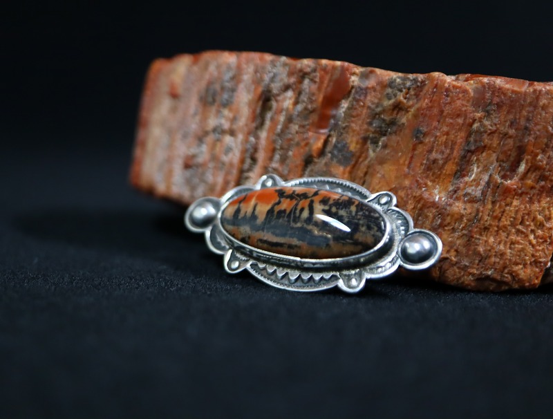 こちらの作品にセットされたペトリファイドウッドもインディアン居留地に近い場所で産出したものと思われ、アリゾナやニューメキシコ産らしい柔らかい色相のオレンジをベースに、強く深いブラックやブラウンで構成され、アンティークジュエリーの渋い質感を持つシルバーと素晴らしい調和を見せるワイルドでナチュラルな印象と、美しい艶や深淵な表情による上質感を持ったペトリファイドウッドです。