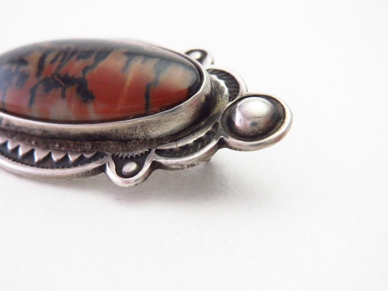 ハイドームなカボションカットのペトリファイドウッドがメインに構成され、石の周辺には細かな文様を刻みこむ質の高いスタンプワークが力強く刻まれています。そして、そのスタンプワークに呼応するようにエッジがカッティングされ『スキャロップドエッジ』(ホタテ貝)とも呼ばれる細かな動きのあるシェイプが形成されています。さらに、両サイドには鏨(鉄製の金型ツール)の凸と凹を用いてシルバーを叩きだすことで立体的な凹凸を作る『リポウズ/バンプアウト』が施されており、小さなラウンド型のリポウズの為、ナバホパール(真珠)やシルバーボールの様にも見えます。またそれが、作品に上品で豊かな表情を与え、とても効果的なポイントとなっているようです。