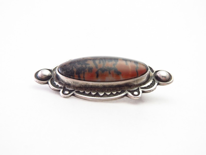 【NAVAJO】ナバホの彫金技術発展期を支えた名工の一人【Luke Billy Yazzie】ルーク・ビリー・ヤジーによる作品。とてもクオリティーの高いシルバーワークをベースに、オレンジ×ブラックを基調とした美しい【Petrified Wood】ペトリファイドウッド(木の化石)がマウントされたビンテージ/アンティークピンブローチです。伝統的な技術やディテールをベースにしながらも、作者の特別な技量と造形センスを感じとることが出来る貴重な作品です。