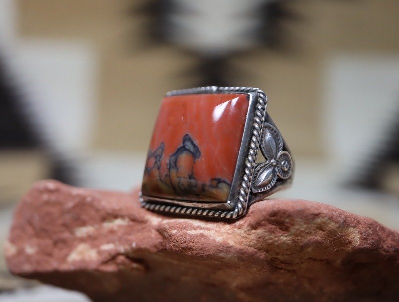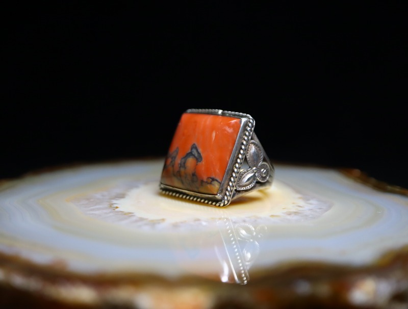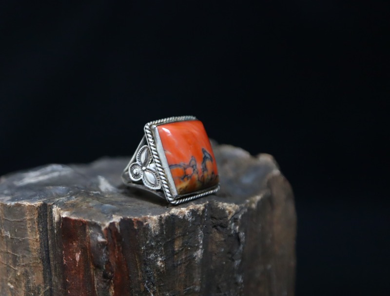 そんなペトリファイドウッドの存在感と共に、オーセンティックで上質なシルバーワークが特徴的なリング。クラシックで完成されたデザイン/造形とシックで神秘的なペトリファイドウッドの作り出す雰囲気は、男性に向いた落ち着いた印象です。