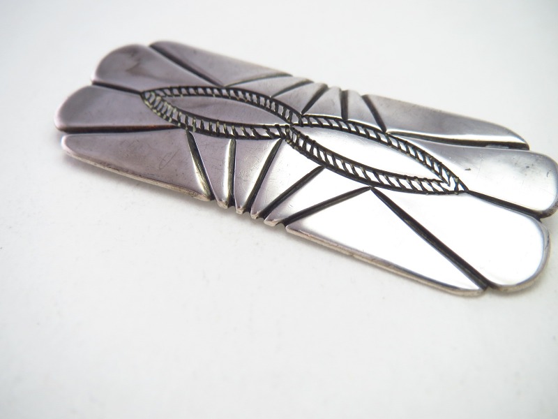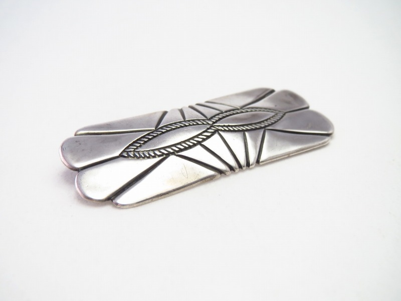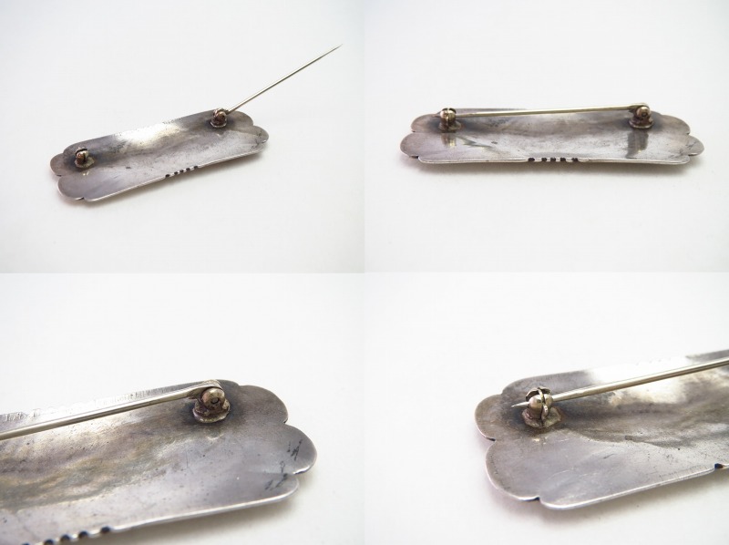 【NAVAJO】ナバホのアンティークジュエリー、ホールマーク(作者や工房のサイン)が刻印されていない為、正確に作者や背景を特定することは出来ませんが、独特なシェイプや造形スタイル等から【The Navajo Arts & Crafts Guild】 (NACG)=通称『ナバホギルド』、または『U.S.NAVAJO』の刻印で知られる【Indian Arts & Crafts Board】(IACB)の認証を受けたトレーディングポストやインディアンスクールの彫金クラスで制作されたと推定可能な作品。ナバホジュエリーの伝統的で原始的な製法で形作られながら、非常にクリーンで完成された造形美、そして特別なオリジナリティが与えられたアンティーク/ビンテージピンブローチです。