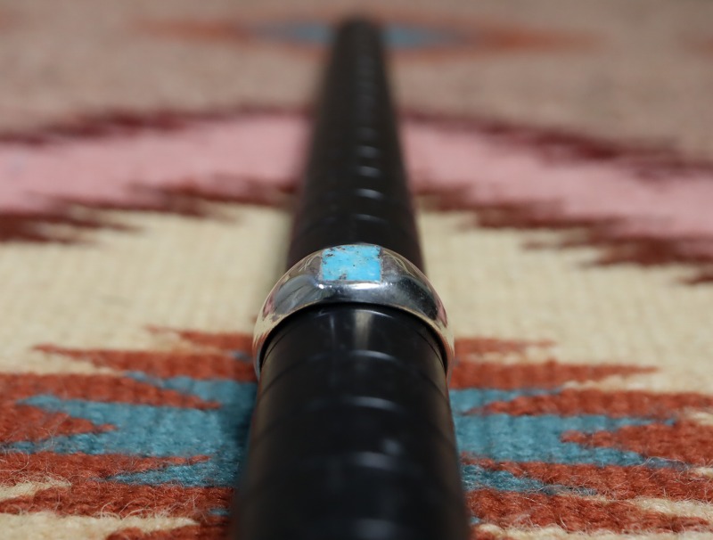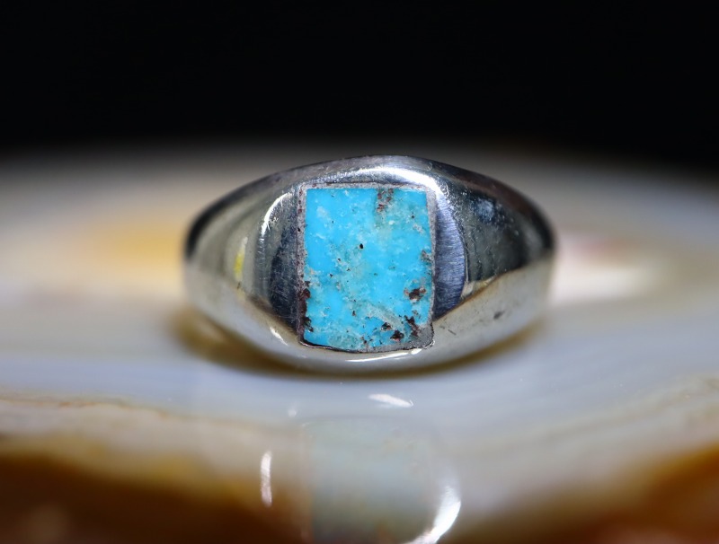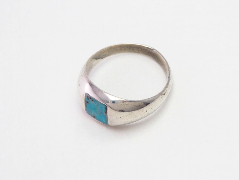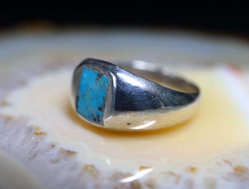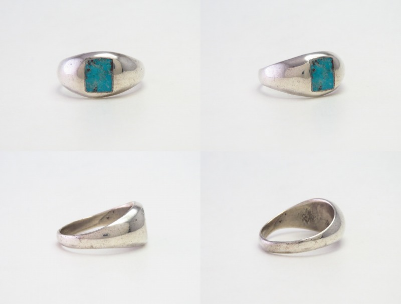 キャスト(鋳物)で成形されたドームシェイプのシャンクにスクエアカットのターコイズがインレイされています。シンプルでクラシックでありながら、スクエアカットターコイズによってモダンな印象が与えられており、ベースとなっているシルバーの柔らかな曲面が非常に指に馴染みの良い造形と使いやすいボリューム感となっています。