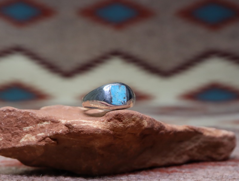 【NAVAJO】ナバホのビンテージジュエリー、キャストによって成形され、ぽってりとした独特なフォルム(ドームシェイプ)を持った造形をベースに、ナチュラルで味わい深いターコイズがインレイされた作品。現代的な印象とミニマルな造形美を持ったビンテージリングです。