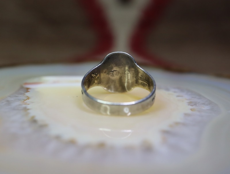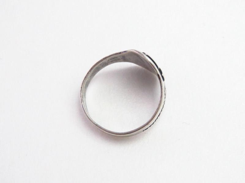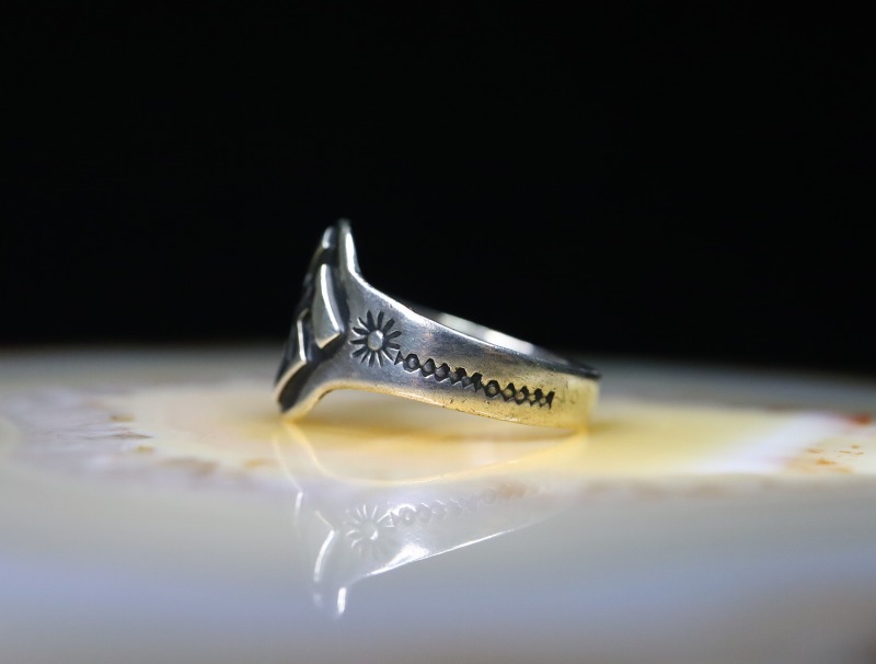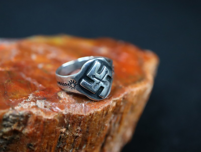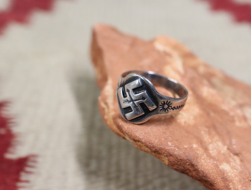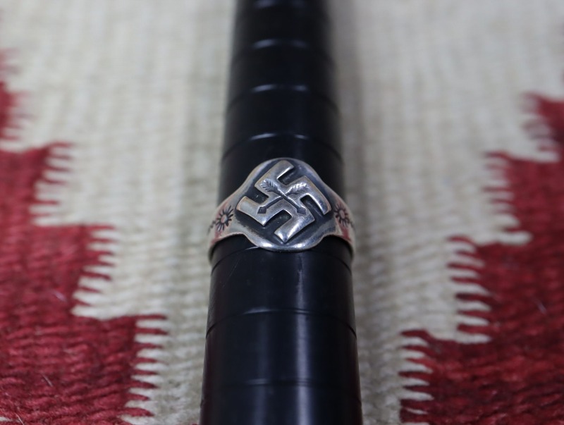 【NAVAJO】ナバホのアンティークジュエリー、控えめなボリューム感のシガーバンドシェイプをベースに、クロストアローズのスタンプワークが刻まれた【逆卍】Whirling Log/Nohokosのアップリケが施された作品。クラシックで伝統的なアイテムながら現存数が少なく、貴重なアンティーク/ビンテージリングです。