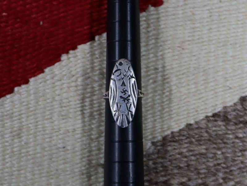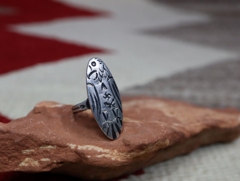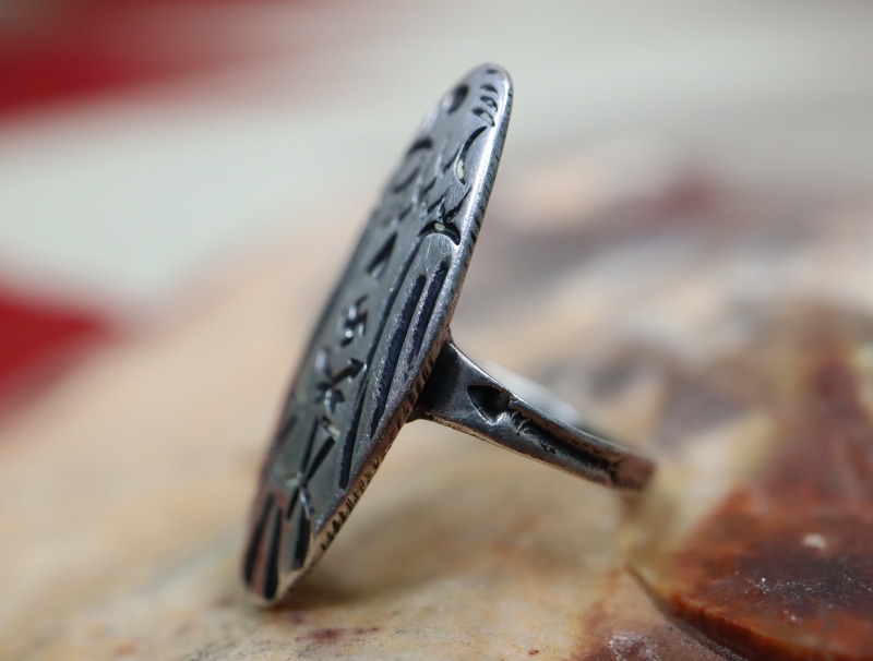 【NAVAJO】ナバホのアンティークジュエリー、古典的なオーバルフェイスが野趣あふれる表情のサンダーバードで構成された、デザインのギャップがとても魅力的な作品。シンプルながら伝統的な技術で形作られた小さいサイズのアンティーク/ビンテージリングです。