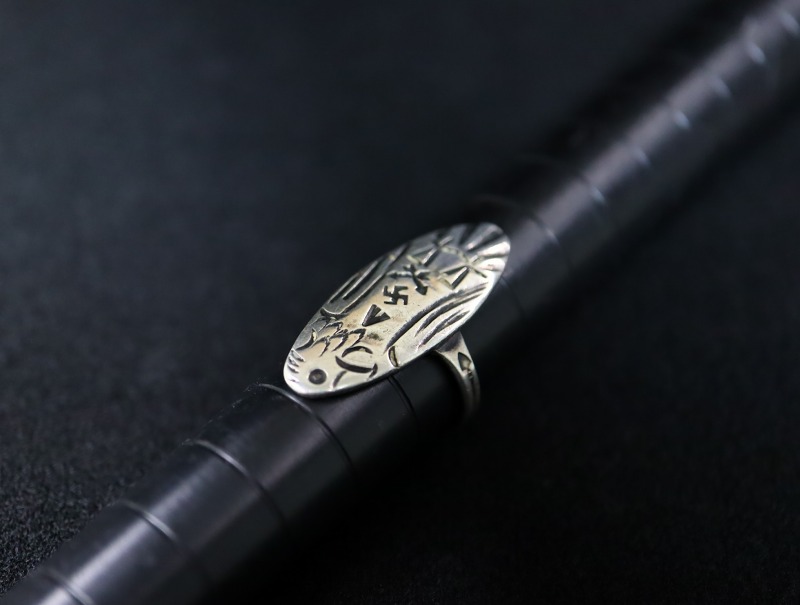 インゴットシルバー(銀塊)から成形されたフェイスは、翼を閉じたサンダーバードが巧みなデザインワークにより、縦に長く美しいオーバルシェイプの中に描き出されています。さらに、スタンプワークによって細部が構成され、中央には【逆卍】Whirling Log/Nohokosやクロスアローズのモチーフが刻まれています。また、尾の部分などは深く立体感のあるスタンプが刻まれ、サンダーバードの脚部はとても素朴で愛らしいタッチのスタンプワークとなっており、当時のキャッチーなセンスとエスニシティな味わい、そしてアンティーク独特な古拙の美を感じることが出来る作品となっています。