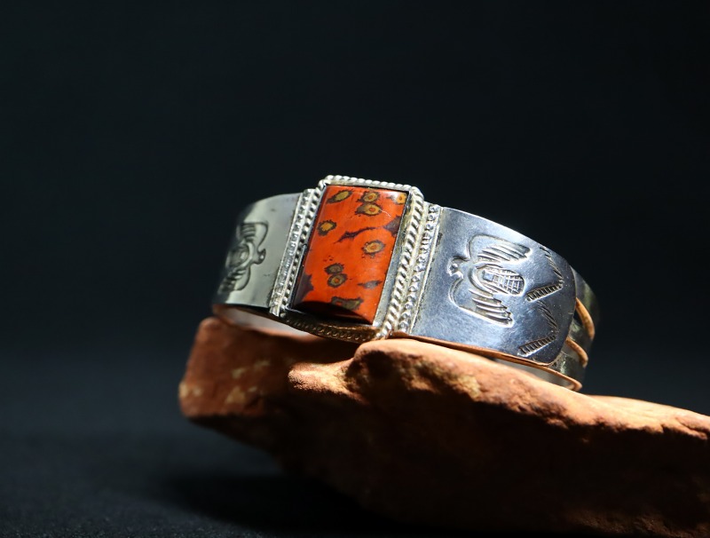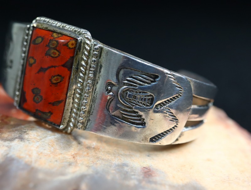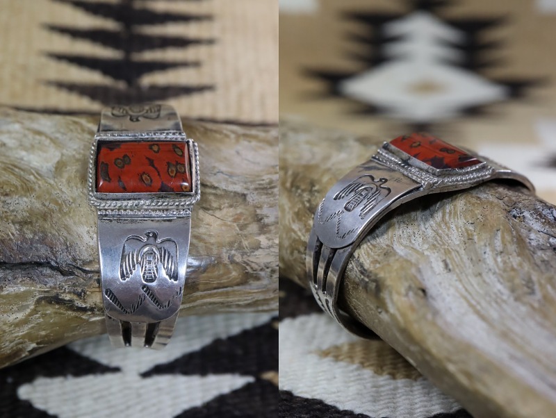 【NAVAJO】ナバホのアンティークジュエリー、ナチュラルでアーシーな魅力を持つ【Red Jasper】レッドジャスパー/赤碧玉がマウントされた重厚な作品。その両サイドに施された迫力のあるサンダーバードモチーフのスタンプワークも特徴的で上質なアンティーク/ビンテージバングルです。