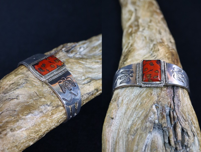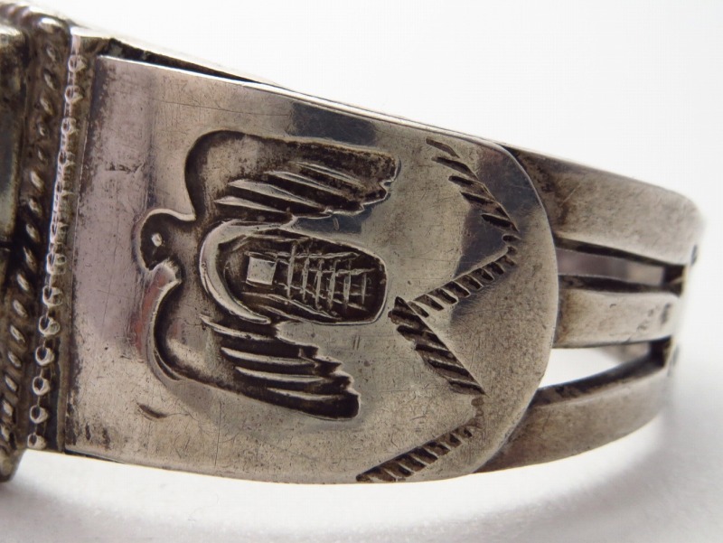 そのセンターにはレクタングラー(長方形)シェイプにカットされたレッドジャスパーがマウントされ、そのベゼル(覆輪)の外側にはツイステッドワイヤーが配されています。そして、その両サイドは1930年代以前の特徴を持ったサンダーバードモチーフが大きく刻まれたアップリケ/パッチワークで構成されています。このスタンプ/鏨ツールだけで制作された時代を特定することは出来ませんが、本作の様な格子模様や四角い文様が含まれたサンダーバードのデザインは、1910年代~1930年代の作品で多く見られる特徴となっています。また、アンティーク作品特有のクオリティを持つスタンプ/鏨ツールであり、作者の高い技術とクリエイティビティも感じられます。