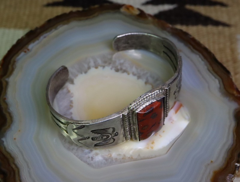 ナバホの伝統的な造形スタイルや製法で構成されたオーセンティックなシルバーワークの作品ですが、細部には作者の個性が光り、レッドジャスパーの持つシックで幻惑的な印象により独自性のあるバングルに仕上がっています。