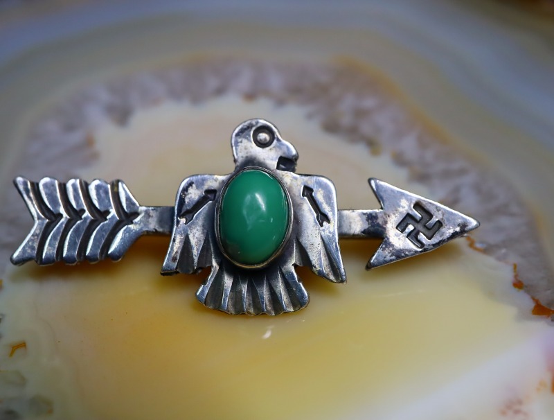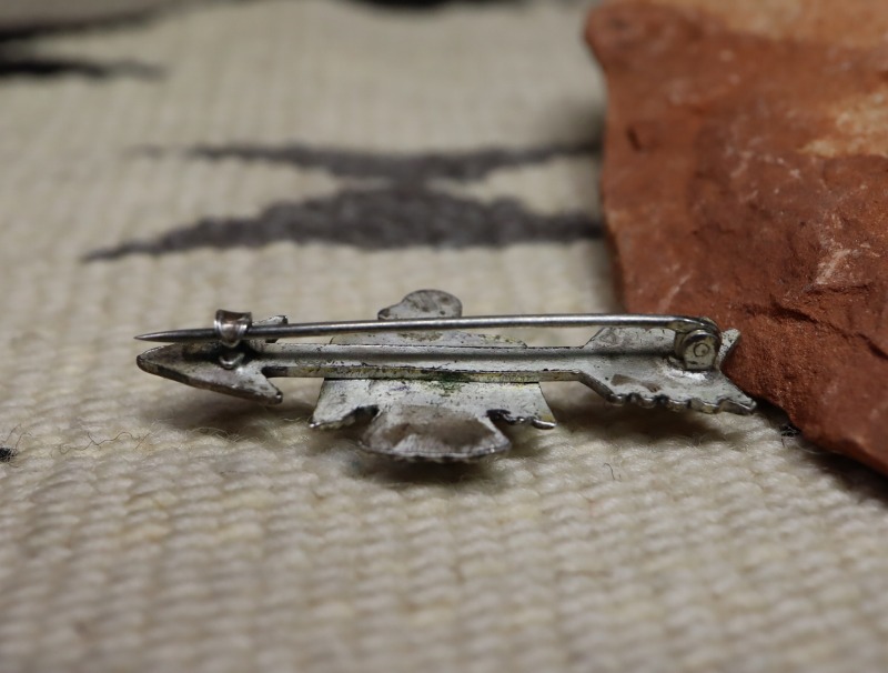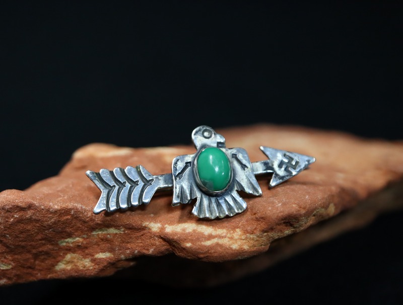 【Fred Harvey Style】フレッド・ハービースタイルや【Tourist Jewelry】ツーリストジュエリーと呼ばれる、20世紀前半頃にアメリカ中西部の観光客向けに制作されたスーベニアアイテム(土産物)の一つ。【卍】Whirling Log/Nohokosのスタンプが刻まれたアローと、小さなサンダーバードが一体となったキャッチーで愛らしいデザインのアンティーク/ビンテージピンブローチです。