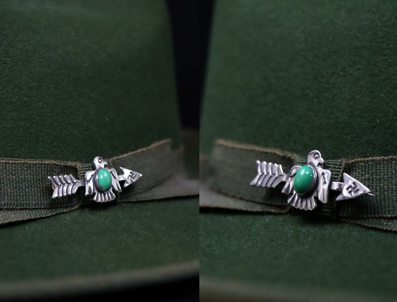1930年代~1940年代初頭頃のピースと思われ、ツーリストジュエリーやフレッド・ハービースタイルを代表するようなサンダーバード&アローモチーフのピース。アローシェイプにサンダーバードがアップリケ/パッチワークされ、アローや卍等、全体に細かなスタンプワークが刻まれることによってサンダーバードやアローの細部が描き出されており、キャッチーな印象のデザインにインディアンジュエリーらしい表情が与えられています。サンダーバードの中央には、小さいサイズながら高さのあるグリーンターコイズがマウントされ、フラットな色相の石ながら透明感を備えたナチュラルターコイズです。また、そのターコイズのベゼル(覆輪)には『ベゼルカップ』と呼ばれる既製のパーツが用いられており、マシン&ハンドメイドのハイブリッドなピースとなっています。