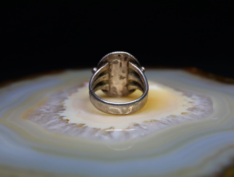 サイズは10号程度ですが、男性のピンキーリングとしても向いた作品であり、性別を問わず日常のコーディネイトにおいて素晴らしいアクセントになり得るビンテージジュエリーです。また、洗練されたシルバーワークを含め、アートピース・ウェアラブルアートとしても評価できるリングとなっています。