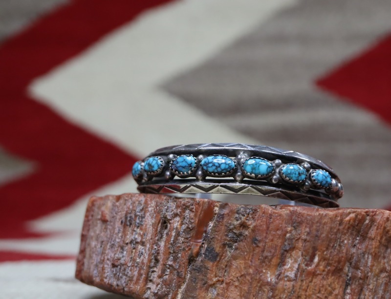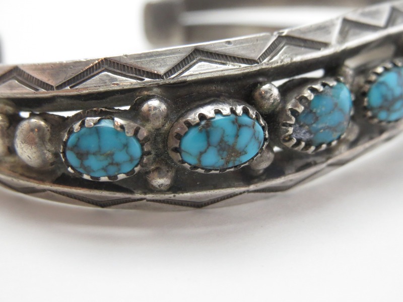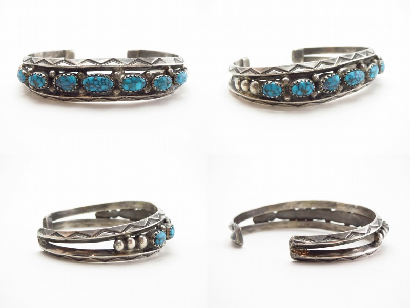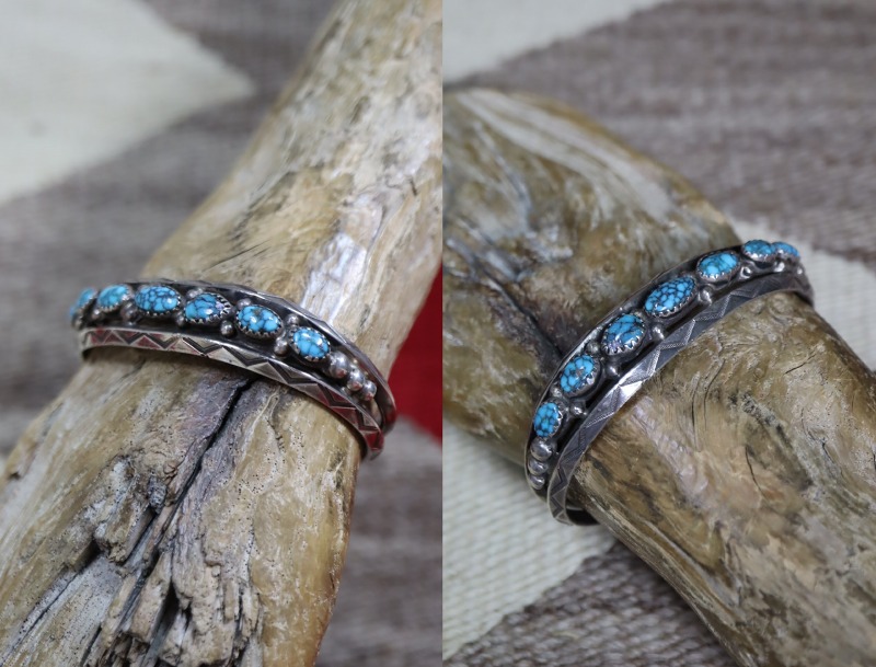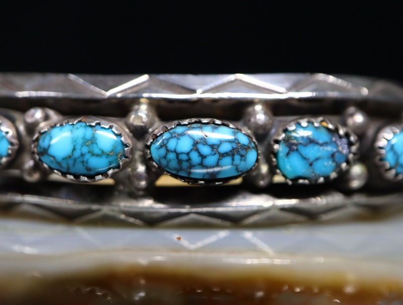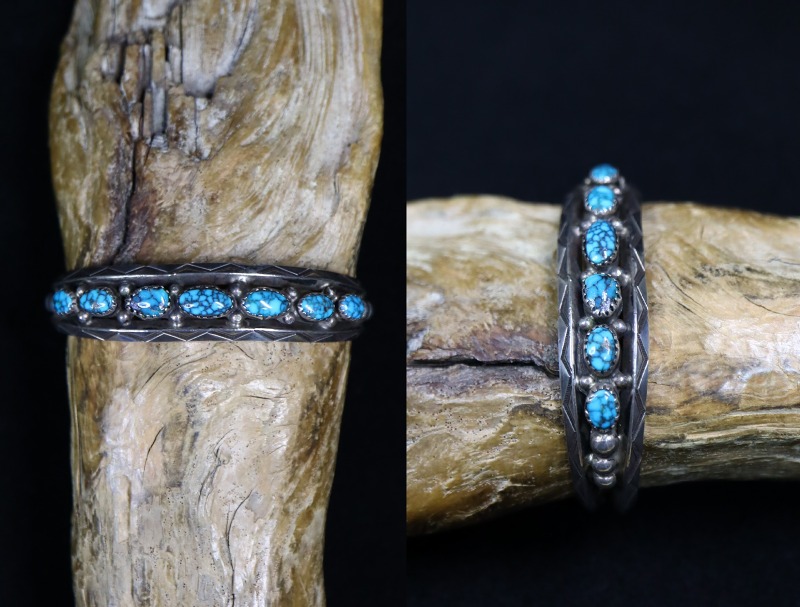1930年代末頃~1950年代に作られた作品で、インゴットシルバー(銀塊)から成形されたと思われるトライアングルワイヤー2本に挟まれるように、7つの大変美しいハイグレードターコイズが羅列されており『Row Work/ローワーク』と呼ばれる造形スタイルに仕上げられてます。このような石を連続してセットしたローワークは、ナバホのトラディショナルなスタイルの一つであり、とても男性的で威厳のある印象を作りターコイズの際立った存在感を強調・演出します。また、それらの石を固定するベゼル(覆輪)には、エッジに刻みの入るノッチドベゼル/トゥースベゼルが採用されており、それら細部のディテールを含め、すべてハンドメイドで仕上げられた作品となっています。さらに、それぞれ石の間と両サイドにはシルバーボールが配され、上下のトライアングルワイヤーには力強く美しいスタンプワークが刻まれることでナバホジュエリーらしい複雑な表情や奥行きが与えられているようです。