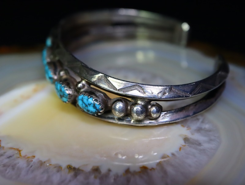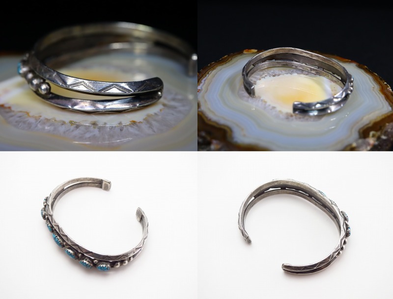 伝統的でプリミティブな彫金技術によるアンティークナバホジュエリーの武骨でワイルドな印象と、クラシックなデザイン/造形、さらに少し控えめなボリューム感により、落ち着いた佇まいを持つブレスレットとなっています。それは、ビンテージスタイルにはもちろん、ドレスや少しフォーマルなスタイルにも馴染む汎用性を有し、多くのスタイリングにおいてさり気なくも特別な存在感を放つ作品です。