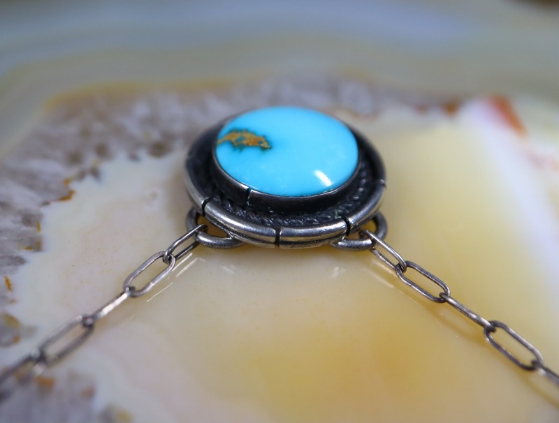 マウントされたターコイズは、大変美しい艶と透明感を持ったジェムクオリティターコイズで、オールドパージャンターコイズ等が推測されますが、鉱山の特定は困難です。澄んだターコイズブルーの一部に柔らかなゴールドのマトリックスが入り、大きな石ではありませんが素晴らしい煌めきと品位を持った無添加ナチュラルターコイズです。