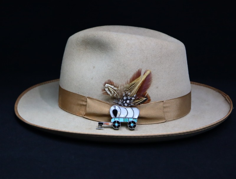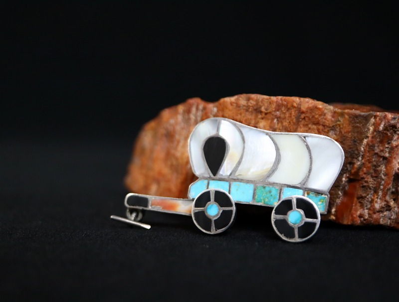 【ZUNI】ズ二のビンテージジュエリー、伝統的なモチーフの一つである『幌馬車/Covered Wagon』がチャンネルインレイによって造形された作品。モチーフのキャッチーな印象とズニらしい美しいカラーリング、そして、細部まで拘り抜かれたシルバーワークも特徴的なアンティーク/ビンテージピンブローチです。