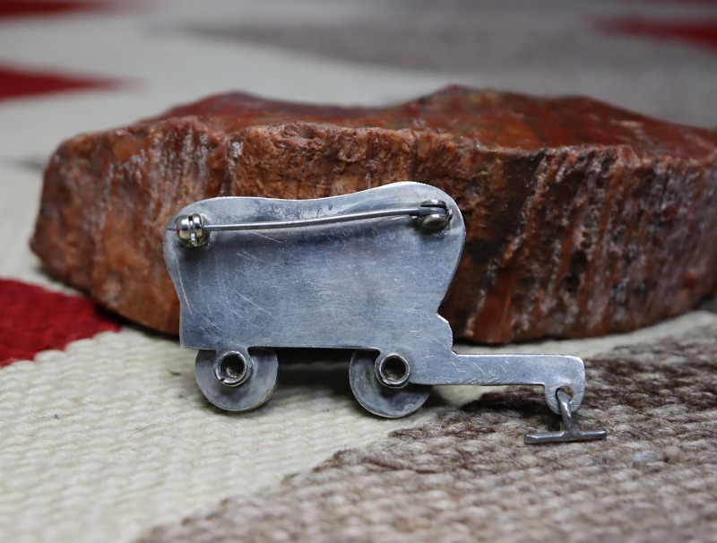本作の様なカバードワゴン/幌馬車をモチーフとした作品は、1940年代以前から見られる伝統的なモチーフの一つですが、ナバホやホピの作品では殆ど見られないズニジュエリー特有のモチーフとなっています。
