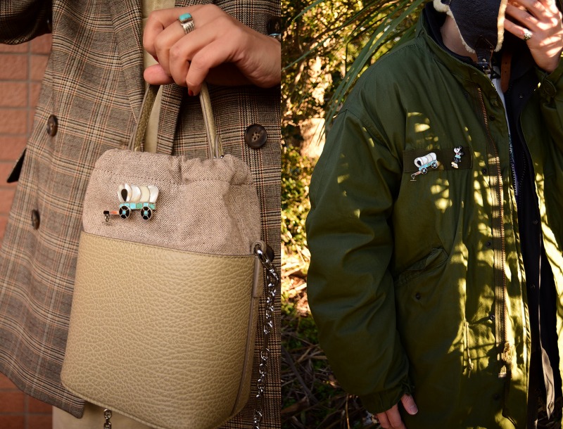 またそのカラーリングと質感は多くの素材に馴染みが良く、さりげなく使えるナチュラルな印象です。様々なスタイルや、ナバホ・ホピ等のジュエリーとも相性が良くスタイリングしやすいアイテム。さらに、こちらの様なピンブローチは、ラペルやハット等多くのアイテムと合わせることができます。