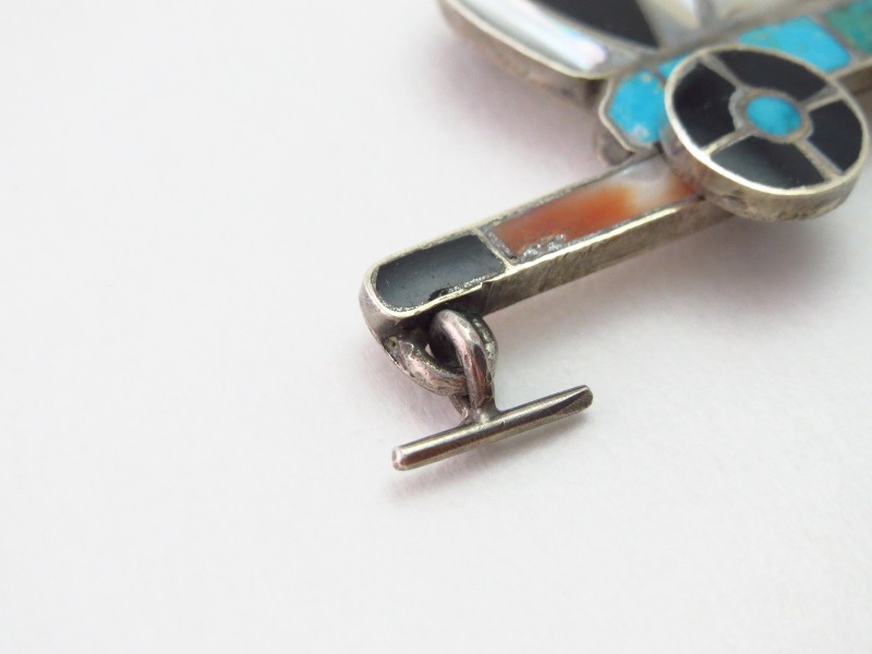 1940年代~1960年代に作られたと思われる作品で、現代のズニジュエリーでは非常に少なくなってしまった質の高いターコイズがセットされています。インレイの土台となるシルバーワークも、量産に向いたキャスト(型を使った鋳物)ではなく地金製法によって形作られ、ハンドメイドによる細かく繊細でスペシャリティを持ったシルバーワークとなっています。それは、前後二つの車輪パーツが、実際に回転するギミックが仕込まれていたり、軛(くびき)の先にも揺れ動くフックパーツが施され、さり気ないディテールながらとても手の込んだ仕事であり、作品に特別な存在感や立体造形物としての完成度をもたらしているように感じられます。