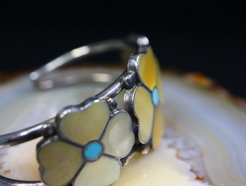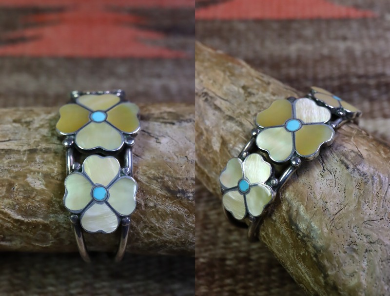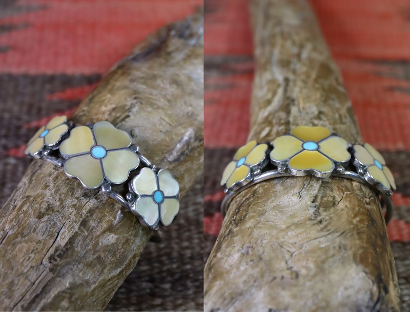 【ZUNI】ズ二のビンテージジュエリー、『Desert Rose/砂漠のバラ』をモチーフとした作品で、イエローのマザーオブパール(貝殻)とターコイズをインレイすることで表現した可憐なフローラルデザインが愛らしいビンテージ/オールドバングルです。