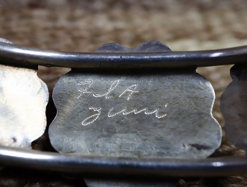 裏面には『ZUNI』の文字と、ホールマーク(作者のサイン)である『FIA』がスクラッチで刻まれており、おそらく【Francis I. Archuletta】の作品と思われますが、現時点では明確な詳細は不明となっています。