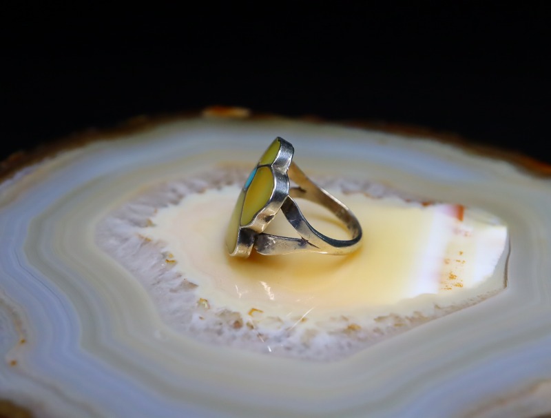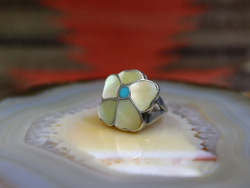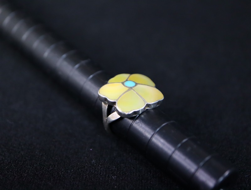 【ZUNI】ズ二の作家【Rosita & Anselm Wallace】ロジータ&アンセルム・ウォレス夫妻(1935-2011)による作品。『Desert Rose/砂漠のバラ』をモチーフとした作品で、イエローのマザーオブパール(貝殻)とターコイズをインレイすることで表現した可憐なフローラルデザインが愛らしくもエレガントなビンテージ/オールドリングです。