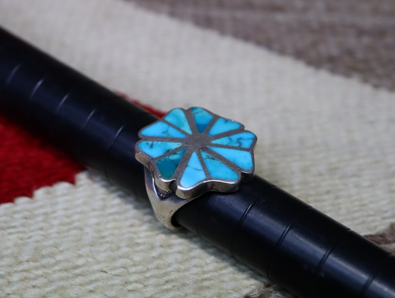 【ZUNI】ズ二か【NAVAJO】ナバホの作品、又は双方の職人の合作によるビンテージジュエリーで『Desert Rose/砂漠のバラ』をモチーフとしたピース。重厚で端正なシルバーワークをベースに、美しいジェムクオリティターコイズのインレイが施されており、古い作品ながらとても洗練された、エンブレムの様なフローラルデザインが印象的なアンティーク/ビンテージリングです。