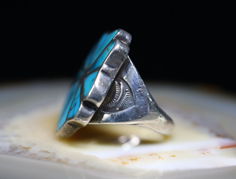ナバホジュエリーの質実剛健なシルバーワークをベースに、緻密な仕事によってターコイズがセットされ、技術としては伝統的でオーセンティックな造形ですが、独自性とデザインセンスを感じさせる作品。サイズやボリューム感等、性別を問わずお使いいただけるリングであり、日常のスタイルに奥行きとアクセントをもたらすことが出来る上質なビンテージジュエリーです。