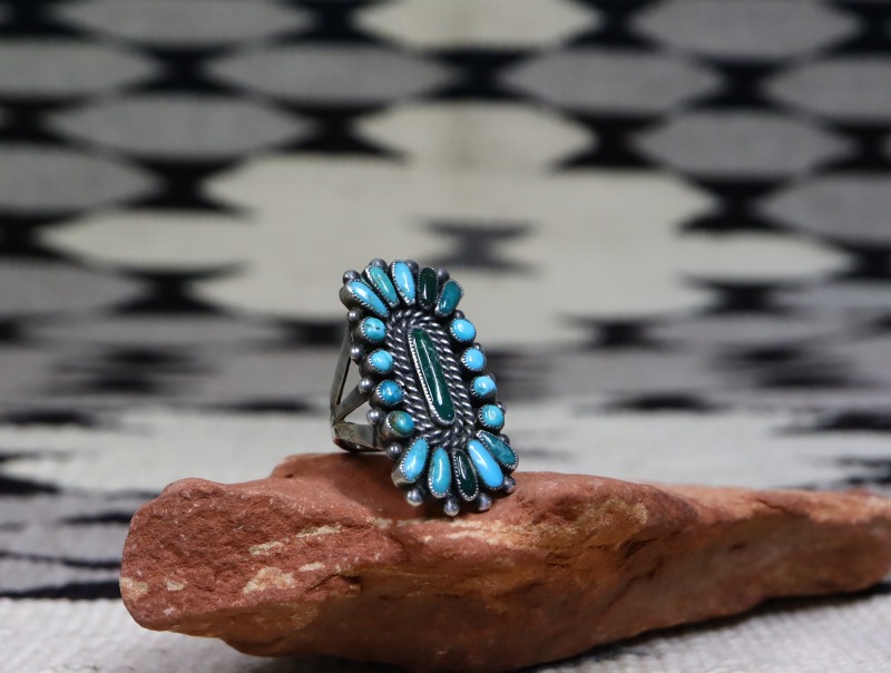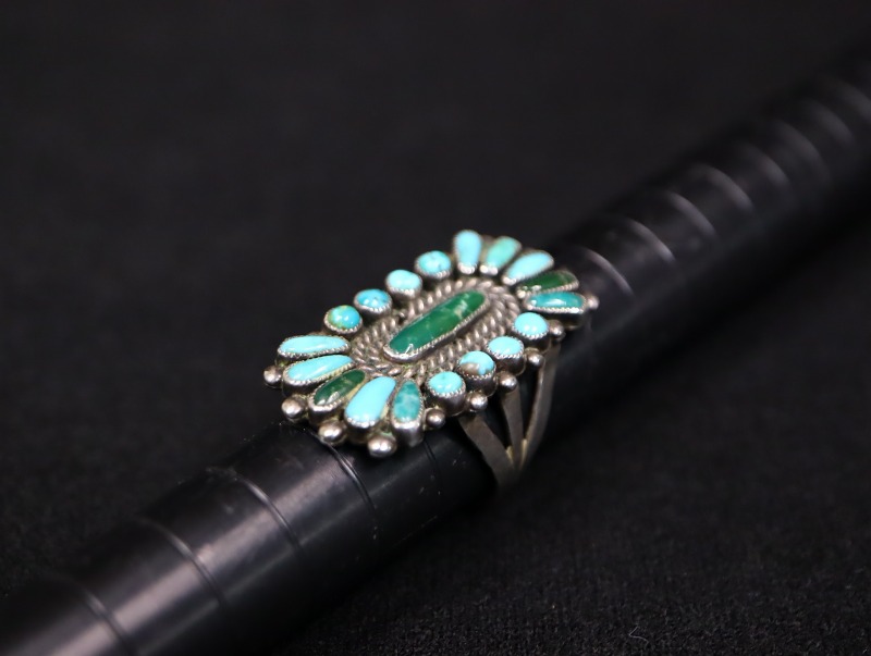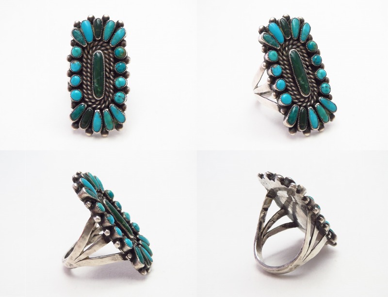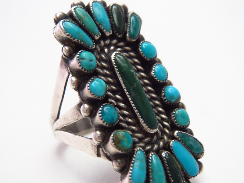 【ZUNI】ズニのビンテージジュエリー、房や集合体という意味を持つ『クラスター』と呼ばれる伝統的な造形スタイルを独自に応用した造形の作品です。無添加ナチュラルなターコイズが使用され、またその美しさが最大限に生かされたハイエンドなアンティーク/ビンテージリングです。