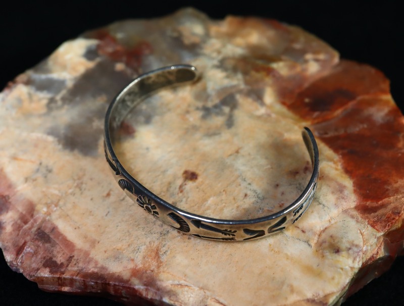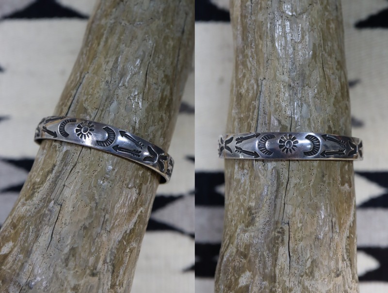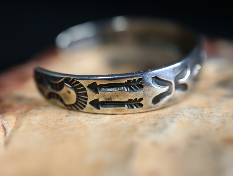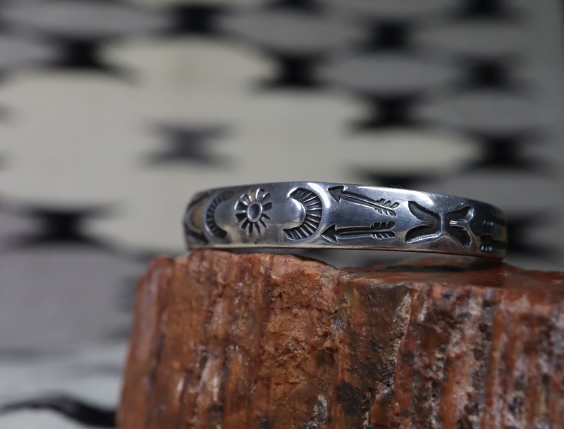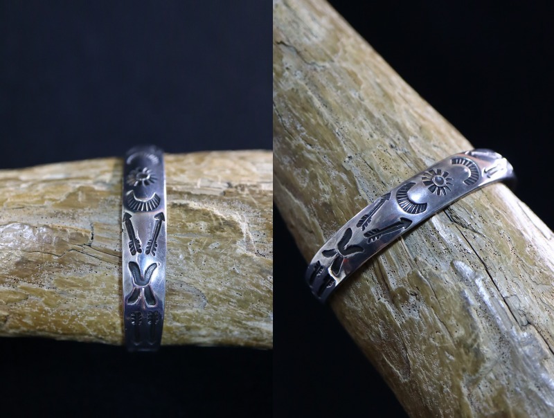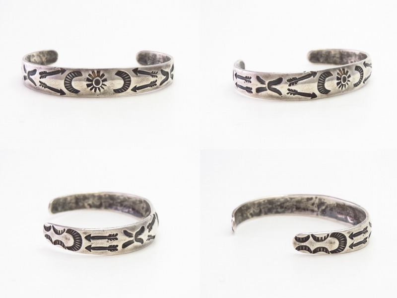 【NAVAJO】ナバホのアンティークジュエリー、当時サンタフェに在った【SOUTHWEST ARTS&CRAFTS】=【Ganscraft】で制作された事が判断可能な作品で、少しドーム型に成形されたバンドをベースに、アロー等のスタンプワークが施されたアンティーク/ビンテージバングル。とても珍しいスモールサイズ(女性のXS-S)というスペシャリティを持った作品です。