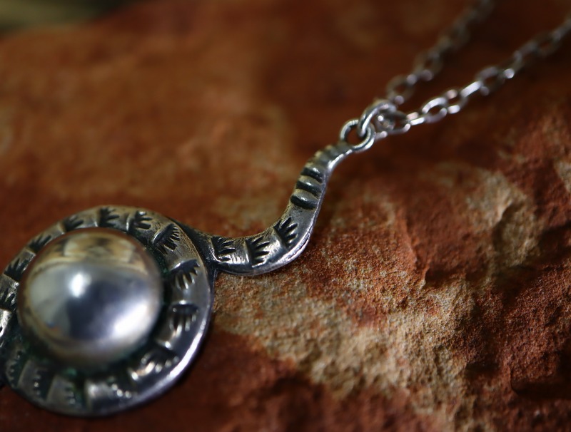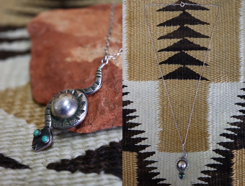 【Tourist Jewelry】ツーリストジュエリーや【Fred Harvey Style】フレッド・ハービースタイルとも呼ばれる20世紀前半頃に観光客向けに制作されたスーベニアアイテムの一つ。ラトルスネーク/ガラガラ蛇と『ナバホパール』とも呼ばれるシルバービーズ(半球体)のアップリケで構成されたトップのアンティーク/ビンテージネックレスです。