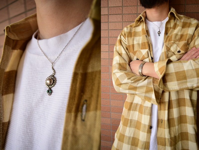 付属のシルバーチェーンは新しいものですが、重厚なシルバー製で、独自にアンティーク加工を施しており、ビンテージピースによく馴染む表情になっています。