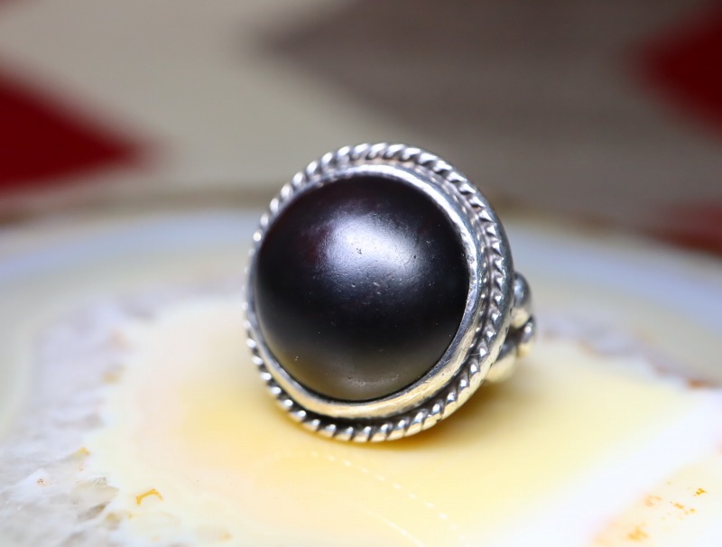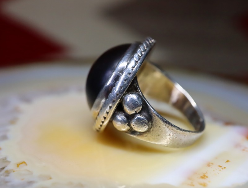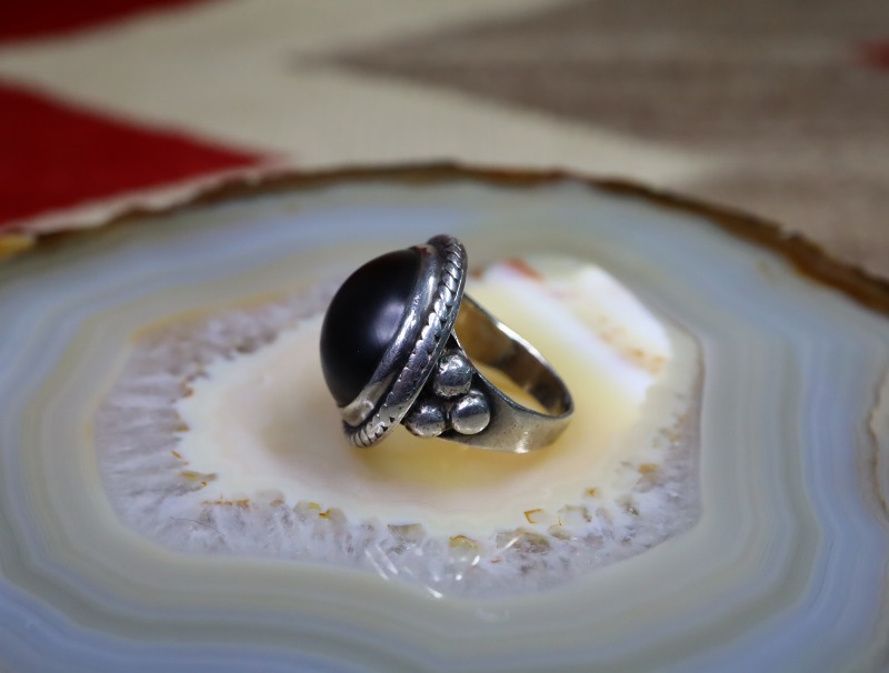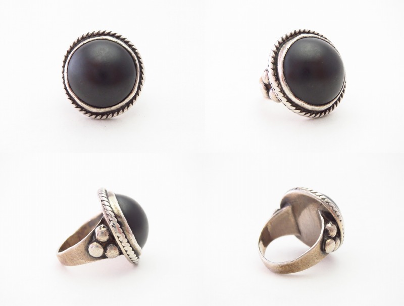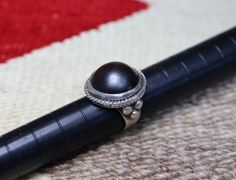 【NAVAJO】ナバホのオールドジュエリー、マットブラックでハイドームなカットのヘマタイト/赤鉄鉱がメインに構成された珍しい作品。シンプルでオーセンティックなシルバーワークをベースにマウントされた、黒真珠の様な黒く重い石が特徴的なオールド/ビンテージリングです。